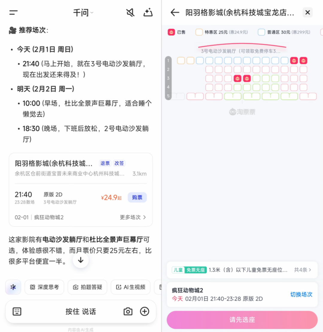 有网友注意到,查询电影票时,已能在千问APP主对话页面购买电影票。记者从千问APP内部人士获悉,AI买电影票功能正在灰测,即将全面上线。