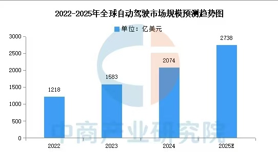 据中商产业研究院发布的《2025-2030全球及中国自动驾驶行业深度研究报告》显示,2023年全球自动驾驶市场规模约为1583亿美元,同比增长29.97%。中商产业研究院分析师预测,2024年全球自动驾驶市场规模将达2074亿美元,2025年将增长至2738亿美元。