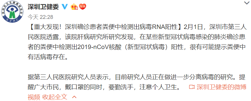 2月1日,深圳市第三人民医院透露,该院肝病研究所研究发现,在某些新型冠状病毒感染的肺炎确诊患者的粪便中检测出2019-nCoV核酸(新型冠状病毒)阳性,很有可能提示粪便中有活病毒存在。