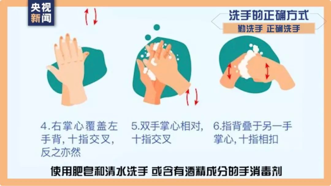 洗手时应注意使用肥皂、香皂、洗手液等清洁用品,并用流动水冲洗,时长不少于 20 秒。
