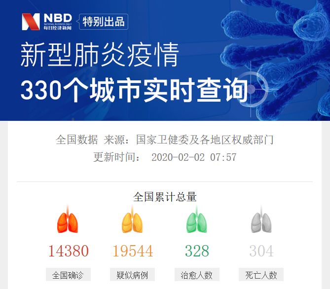 截至2月1日24时,国家卫生健康委收到31个省(自治区、直辖市)和新疆生产建设兵团累计报告确诊病例14380例,现有重症病例2110例,累计死亡病例304例,累计治愈出院病例328例,共有疑似病例19544例。