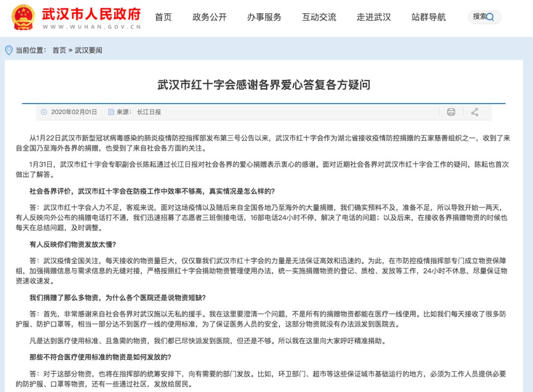 1月31日,武汉市红十字会专职副会长陈耘通过《长江日报》对近期社会各界对武汉市红十字会工作的疑问,首次做出解答。2月1日,武汉市政府官网发布《武汉市红十字会感谢各界爱心答复各方疑问》。