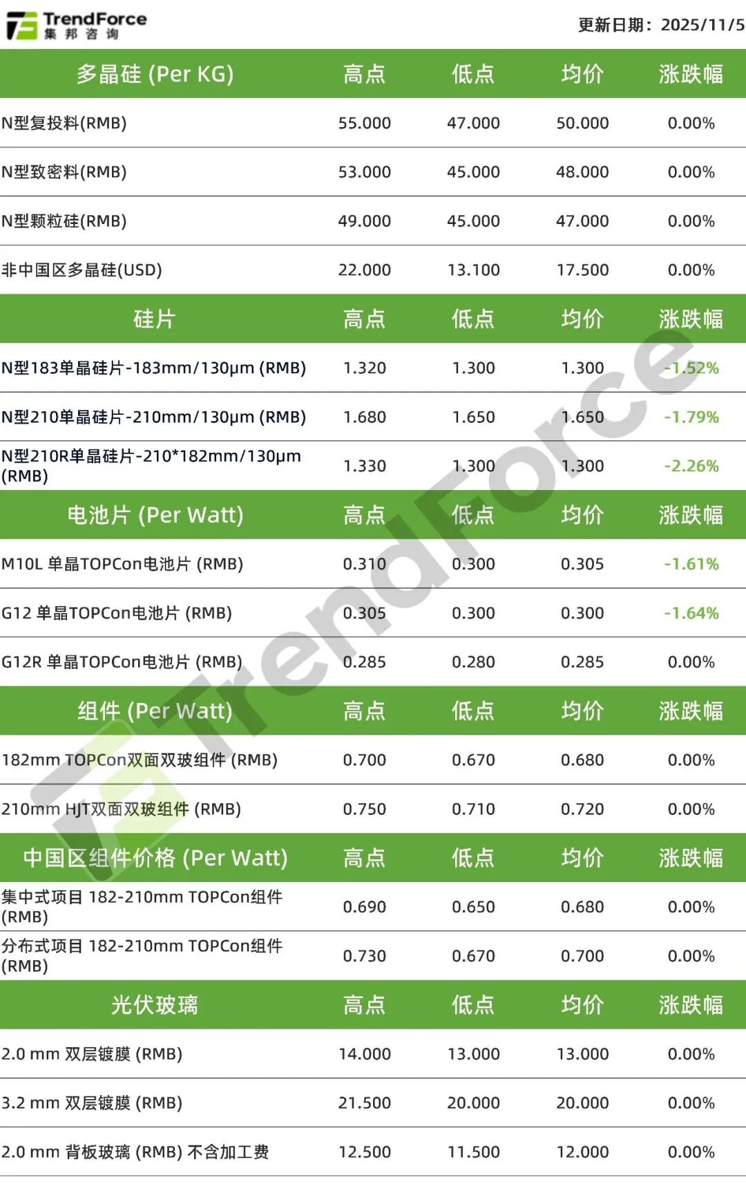 11月6日,TrendForce集邦咨询发布,展望后市,在高位库存压力下,硅料价格持续承压。但11月供给收缩,且市场对硅料“收储”政策仍有预期,价格也存在一定支撑,预计将保持弱势维稳。虽然供需失衡导致价格承压,但如果上游硅料价格能保持坚挺,将为硅片提供有力的成本支撑。在此情况下,叠加“减产挺价”的行业共识,预计硅片价格后续的下跌空间相对有限。