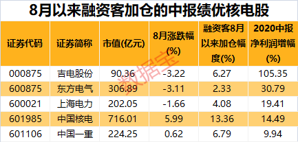 融资客加仓的13股中,有5股上半年净利润实现增长,包括中国核电、中国一重、吉电股份等。具体来看,吉电股份上半年净利润翻倍,融资客8月以来加仓6.27%,公司主要从事风电、火电、太阳能发电等业务,业绩大增主要受益于公司新能源规模扩张与精益管理并重,1-6月存量新能源项目效益好于预期,增量新能源项目效益做出正向贡献。东方电气上半年净利润同比增长30.79%,融资客8月以来加仓2.33%;上海电力及中国核电上半年净利润增幅均超过10%,融资客8月以来加仓中国核电13.36%。