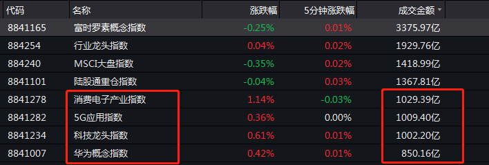值得注意的是,不少科技主题板块正在成为外资、机构等资金抢筹和布局的焦点。从资金涌入的情况看,当天除了富时罗素概念、MSCI等指数资金买入居前之外,消费电子产业、5G应用产业、科技龙头等指数成交金额均超1000亿,华为概念指数涌入金额也超850亿元。