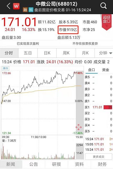 1月16日,中微公司刷出盘中历史新高,报收172.66,市值突破900亿元。从去年12月4日至今,中微公司股价已经从65元一路飙涨至172元,股价翻涨超164%。