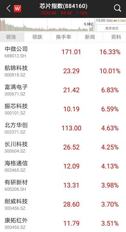 当天,市值超1.5万亿的芯片指数大涨超1.18%,其中龙头股中微公司涨幅16.33%,航锦科技、富满电子、振芯科技等涨幅超6%。板块内超34家个股翻红。