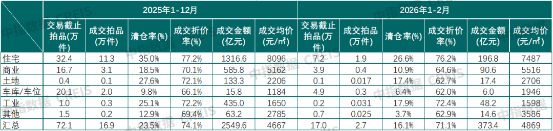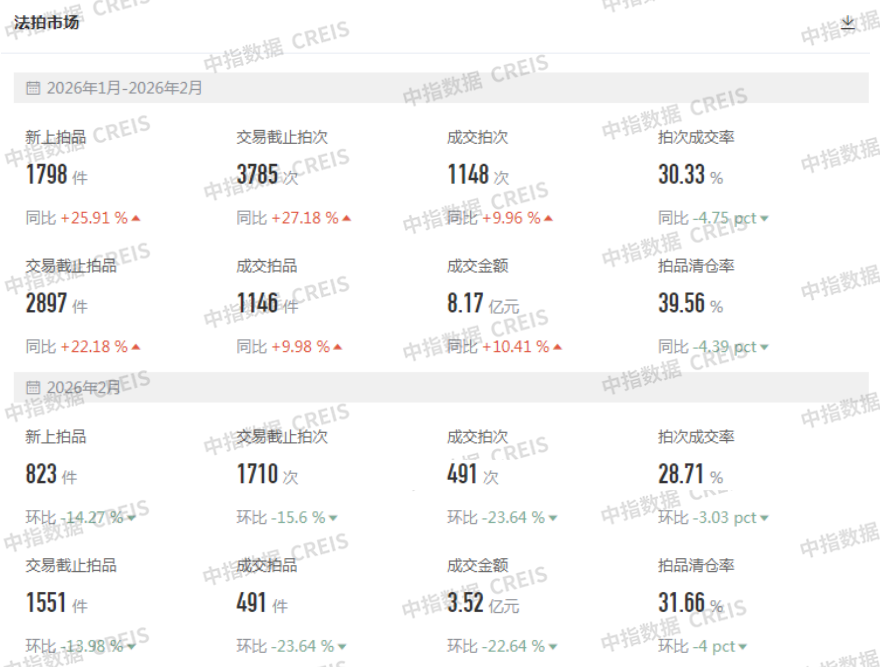 中指研究院发文称,中指法拍数据库监测,2026年1-2月,全国法拍市场各类法拍房源累计挂拍数量17万套,同比下降2.3%,房源累计拍次共21.1万次(同一标的物可能存在一拍、二拍等多次拍卖),最终成交拍品数量为2.7万套,同比下降4.7%,清仓率16.1%(成交拍品/交易截止拍品),总成交金额373.4亿元,同比下降16.5%。各类法拍房源成交均价4869元/㎡,同比下降8.1%,平均折价率为71.1%。