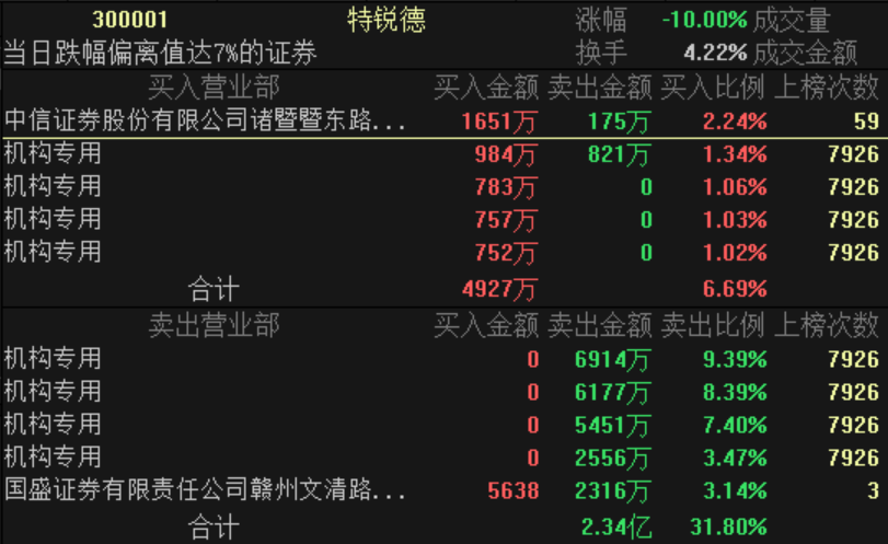 特锐德周一放量跌停,盘后龙虎榜数据显示,机构在其中激烈碰撞,买二至买四都为机构专用席位,而卖一至卖四也全是机构专用席位。买入前五席合计净买入3931亿元,卖出前五席合计净卖出2.34亿元。