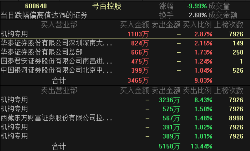 号百控股龙虎榜显示,买一机构专用买入1103万元,买三华泰证券总部买入666万元,买入前五席位合计净买入3465万元。卖一、卖二、卖四、卖五均为机构专用席位,卖二也为知名的游资集结地西藏东方财富证券拉萨团结路第二营业部,卖出前五席合计净卖出5158万元。