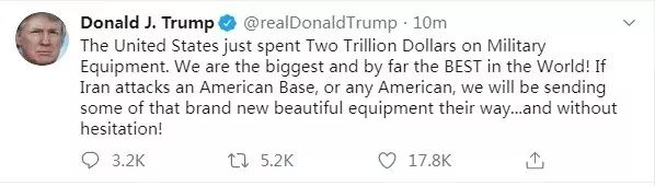 “美国刚刚在军事装备上花了2万亿美元。我们(的装备)是世界上最大的,也是迄今为止最好的!如果伊朗袭击美国基地或任何美国人,我们将毫不犹豫地向他们发射一些全新的、漂亮的装备,并且是毫不犹豫地!”特朗普在推特上写道。