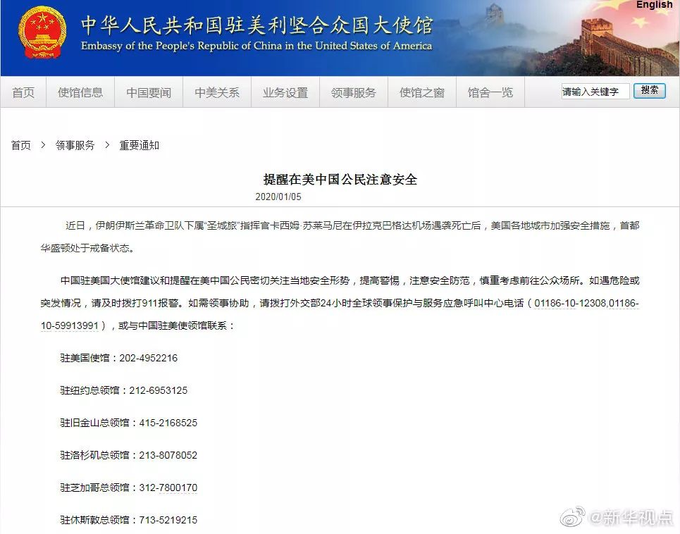 中国驻美国大使馆4日在其官网发布公告,提醒在美中国公民注意安全。