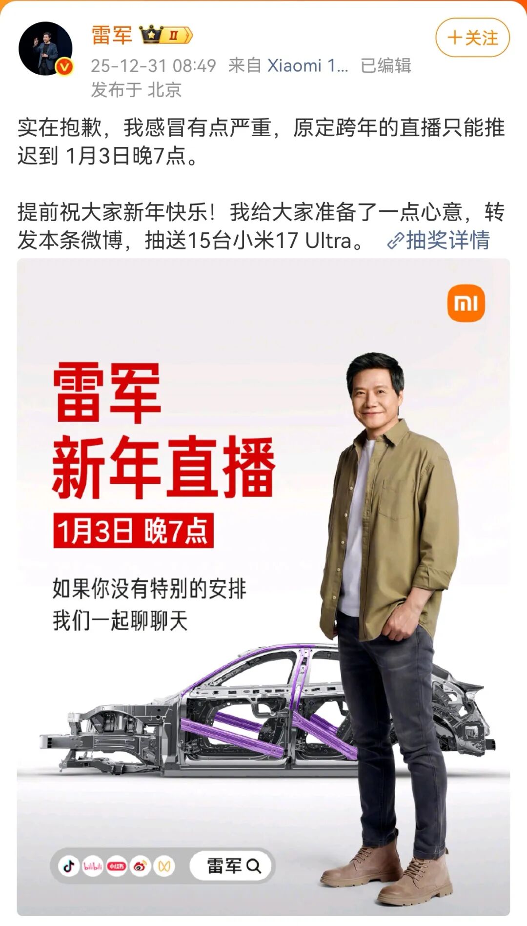 12月31日,雷军发文称:“实在抱歉,我感冒有点严重,原定跨年的直播只能推迟到(2026年)1月3日晚7点。”