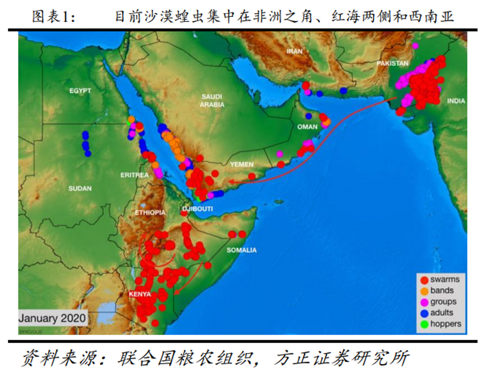 方正证券在研报中表示,密切关注印度和巴基斯坦两国的灾情水平;同时关注蝗灾等级变化,若蝗灾全面进入高潮或瘟疫等级,全球农产品价格或将面临上涨的风险。鉴于蝗灾可能会对全球和国内粮食供应造成影响,存在推高粮食价格走高的因素,建议关注种植业相关标的。