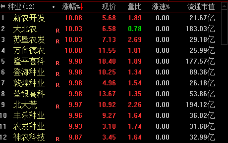 周一午后,种业股集体涨停。截至收盘,板块内大北农、新农开发、隆平高科、丰乐种业等12只个股全部涨停。