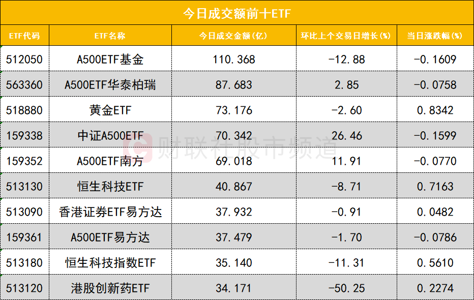 从成交额前十的ETF来看,A500ETF基金(512050)成交额位居首位,A500ETF华泰柏瑞(563360)成交额位居次席。