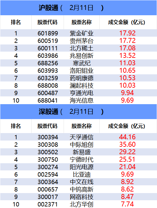 从沪股通前十大成交个股来看,紫金矿业位居首位;贵州茅台和北方稀土分居二、三位。