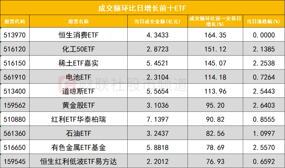 沪深股通今日合计成交2527.26亿,其中紫金矿业和天孚通信分居沪股通和深股通个股成交额首位。板块主力资金方面,有色金属板块主力资金净流入居首。ETF成交方面,恒生消费ETF(513970)成交额环比增长164%。