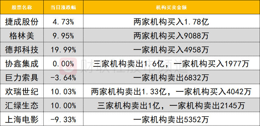 今日龙虎榜机构活跃度有所下降,买入方面,捷成股份获两家机构买入1.78亿。卖出方面,太空光伏人气股协鑫集成遭三家机构卖出1.6亿。