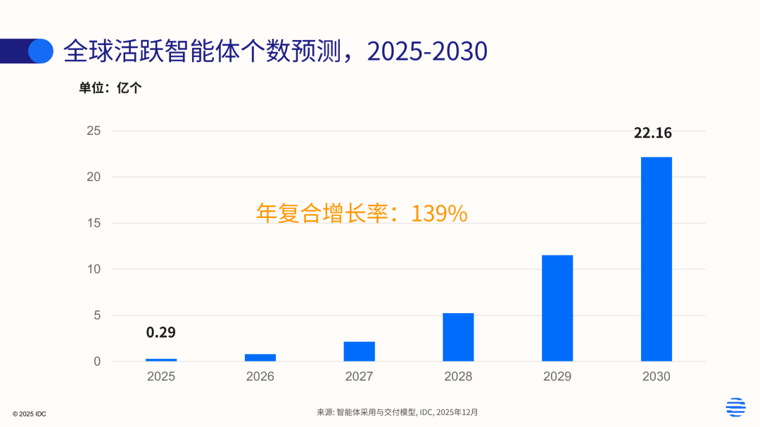 到2030年,全球活跃智能体数量将突破 22.16 亿个,年复合增长率达到 139%,其中工业领域的活跃智能体是最重要组成部分之一。IDC 认为,智能体数量的快速增长将与工业 AI 的规模化需求形成共振:一方面,工业企业对跨系统协同与流程闭环的诉求更强;另一方面,智能体作为“任务编排与流程执行载体”,有助于将 AI 从“点状能力”升级为“可运营的生产力”,从而加速规模化落地。