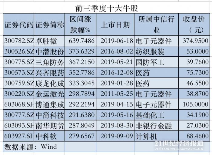 此外,21世纪经济报道记者注意到,十大牛股也有次新股的光环加持。卓胜微、三角防务、康龙化成、博通集成、中简科技、南华期货、中科软均是今年上市的企业。