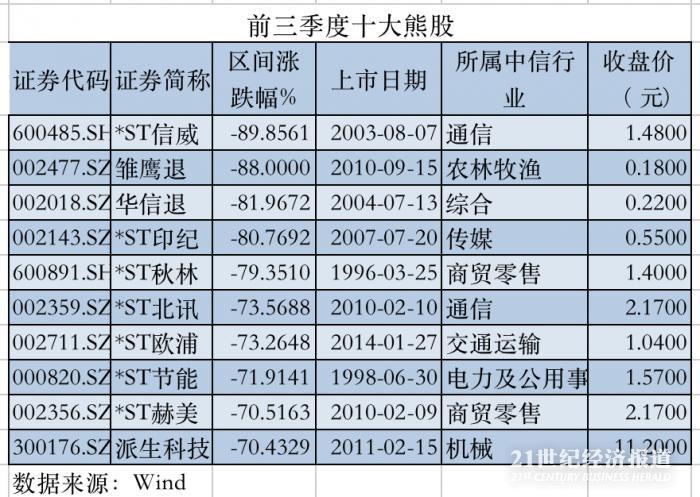 跌幅最大的个股是*ST信威,跌幅达到89%,排在第二、三位的已经被确定退市,分别是雏鹰农牧和华信国际。其次是*ST印纪、*ST秋林、*ST北讯、*ST欧浦、*ST节能、*ST赫美和派生科技。