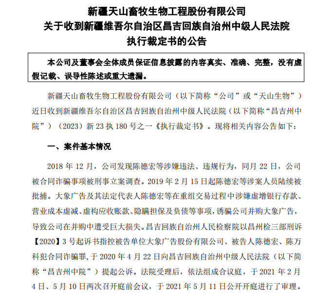 事实的却如此。10月12日晚间,*ST天山又发了一则公告,名为《关于收到新疆维吾尔自治区昌吉回族自治州中级人民法院执行裁定书的公告》。