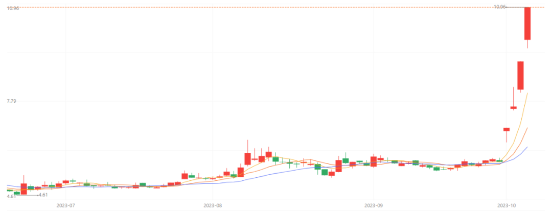 从10月10日复盘,到10月13日收盘,4个交易日里,*ST天山拿下3个20CM涨停,股价从节前收盘价5.74元涨至10.96元,累计涨幅达到90.94%,冠绝整个A股。