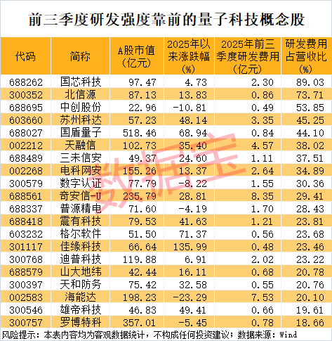 当前A股市场上涉及量子科技产业链的股票超过60只。今年前三季度,这些概念股合计研发费用达到708.14亿元,占总营收的比例为3.83%。其中8股研发费用超过10亿元,包括中国移动、中兴通讯、中国电信、中国联通、国电南瑞等。