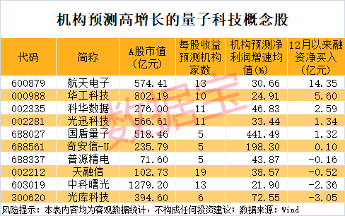 未来增长潜力方面,根据5家以上机构一致预测,2026年、2027年净利润增速均有望超20%的量子科技概念股有10只,如中科曙光、华工科技、航天电子、光迅科技、国盾量子等。