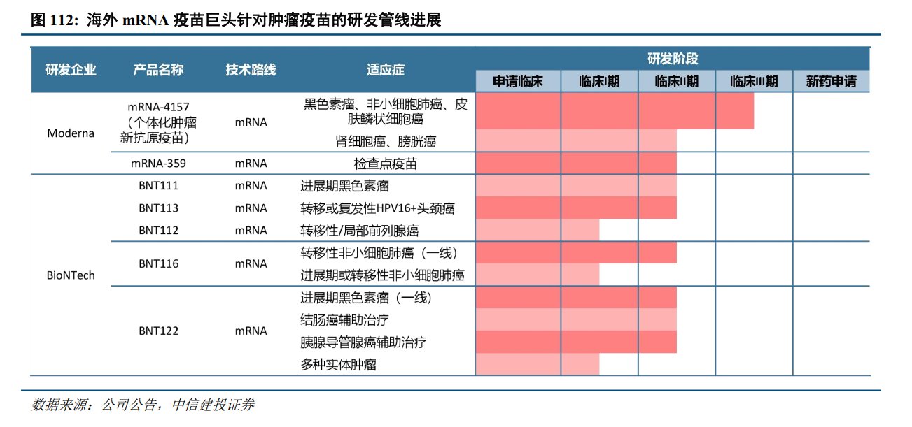 海外mRNA疫苗巨头较早布局肿瘤疫苗。目前海外已有多家企业布局肿瘤疫苗研发,其中Moderna、BioNTech等海外mRNA疫苗巨头通过mRNA技术设计肿瘤抗原,再通过自研的递送载体制作肿瘤mRNA疫苗,目前已有多个管线进入临床II~III期,覆盖适应症包括黑色素瘤、肺癌、皮肤癌等多个肿瘤类型。