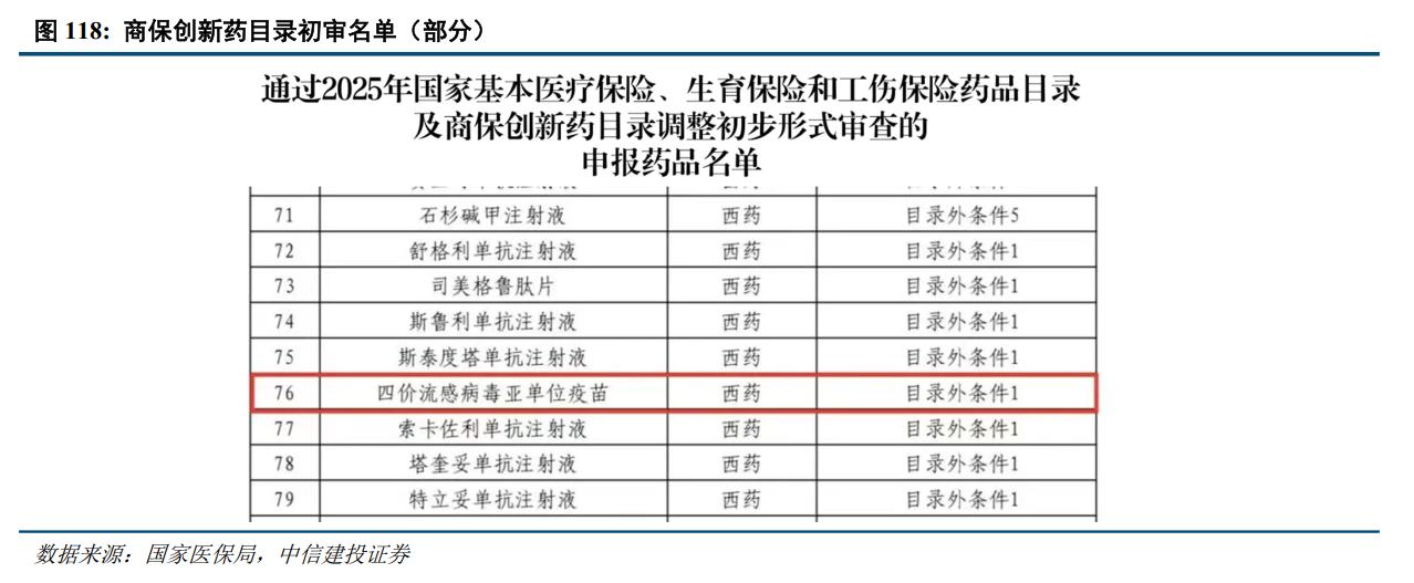 疫苗首入商保创新药目录,开辟新支付通道。2025年8月,国家医保局公布的商保创新药目录初审名单中,中慧生物的四价流感病毒亚单位疫苗成为唯一一款通过形式审查的疫苗产品。这是疫苗首次进入商业保险目录,标志着预防性生物制品在医保支付体系中的破冰。疫苗纳入商保目录,有助于减轻公众经济负担、盘活医保个人账户结余资金,并为高价值创新疫苗开辟了新的支付通道。目前该目录已通过形式审查,后续还需面临专家评审、谈判竞价/价格协商等环节考验。