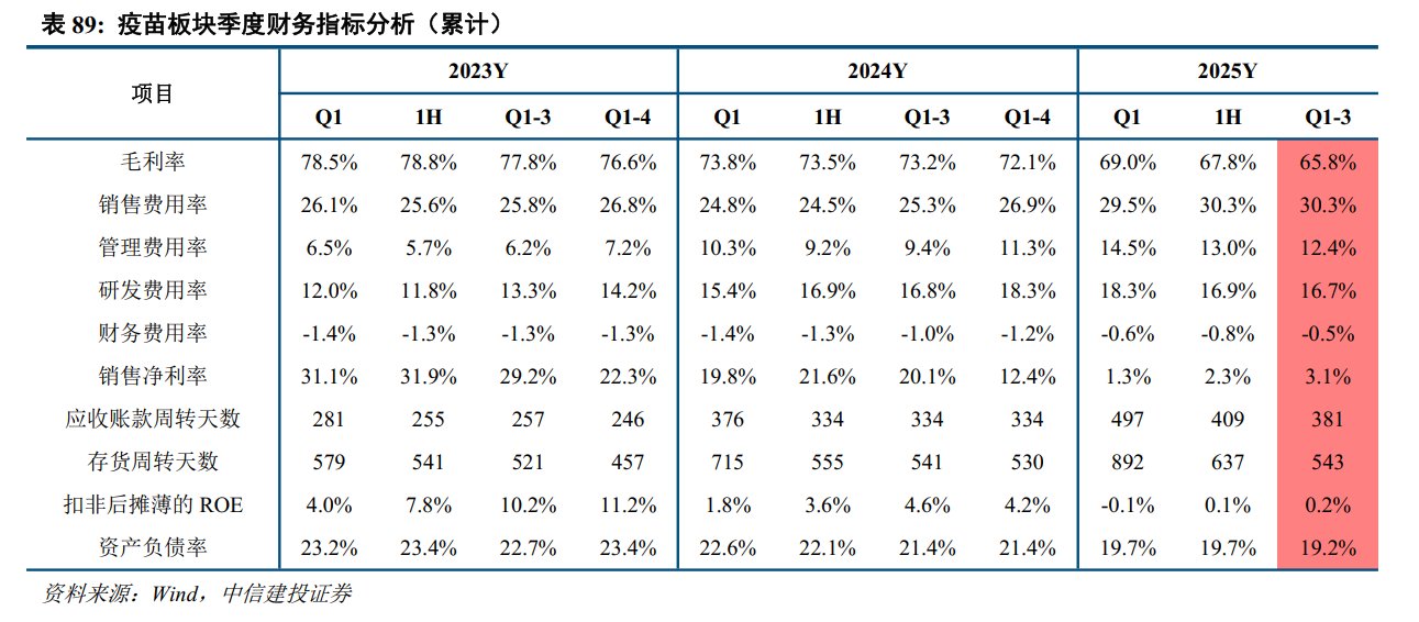 产品销售继续承压,行业竞争格局较为激烈。2025年前三季度疫苗板块业绩呈现下行趋势,主要由于:1)受市场宏观环境影响,消费者需求发生变化,导致疫苗终端销售面临压力;2)部分产品,如2价HPV疫苗、PCV13、狂犬疫苗等竞争格局趋于激烈。利润端下滑速度快于收入端,主要由于:1)收入端下滑而费用端相对固定,费用率同比提升;部分企业加大研发投入,研发费用同比增长。2)部分产品因竞争格局激烈、参与政府采购等因素,价格同比降幅较大。