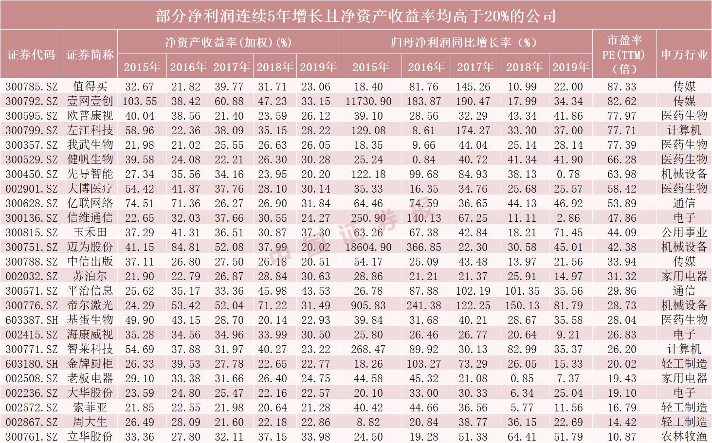 结合净资产收益率进一步统计发现,260家业绩5年连增公司中,有25家公司近5年的净资产收益率均超过20%。其中,玉禾田(300815)、壹网壹创(300792)、海康威视(002415)三家公司近5年净资产收益率更是均超过30%。