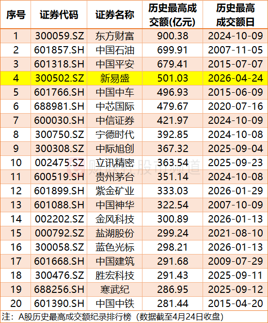 501亿天量成交!新易盛今日成交额跻身A股历史第四
