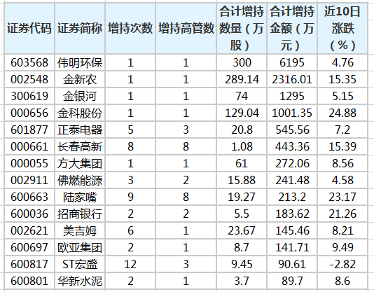 增持次数方面,ST宏盛增持最频繁,近10日共有12条增持记录,陆家嘴、长春高新等紧随其后,近10日分别有9条、8条增持记录。