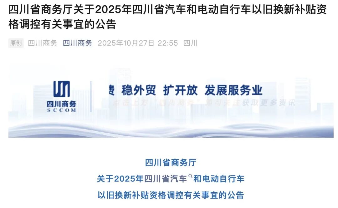 经过短暂等待之后,四川省商务厅于10月27日深夜再度发布相关事宜的公告,为接续实施2025年度四川省消费品以旧换新补贴政策,并公布四川省汽车和电动自行车以旧换新补贴资格调控新政策。