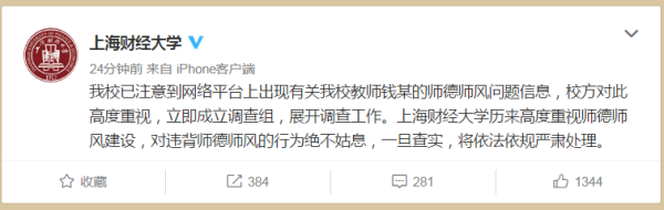12月6日,上海财经大学官方微博发布消息称:我校已注意到网络平台上出现有关我校教师钱某的师德师风问题信息,校方对此高度重视,立即成立调查组,展开调查工作。上海财经大学历来高度重视师德师风建设,对违背师德师风的行为绝不姑息,一旦查实,将依法依规严肃处理。