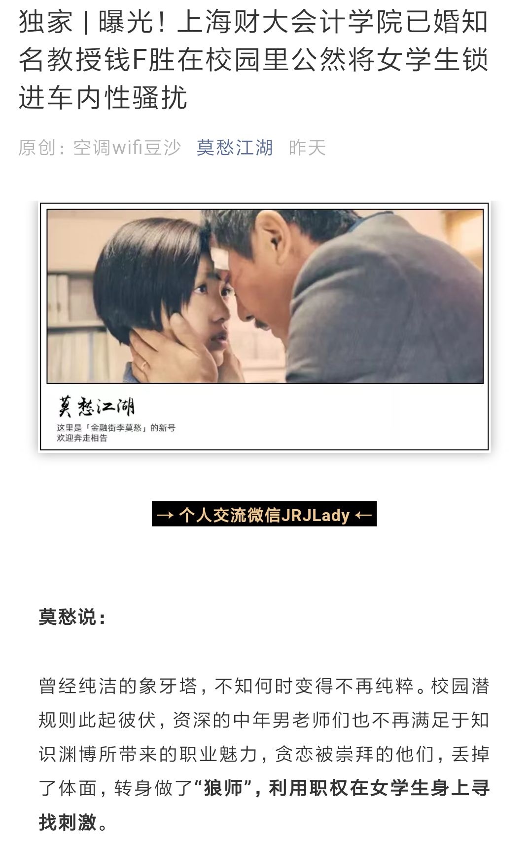 这篇文章公开举报上海财大会计学院的一位教授,对女学生进行频繁的言语骚扰,甚至在校园内公然锁进车内侵犯。文章中写明了详细的过程,并附上了两人此前的聊天截屏、被侵犯时的录音等证据。