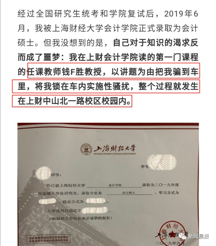 文中,一名自称上海财经大学2019级会计学院女硕士的女生,详细讲述了自己入学以来被学校钱姓教授骚扰、最终发展为车内猥亵的过程,并在文内配以录音、聊天截图以及实拍照片等信息。