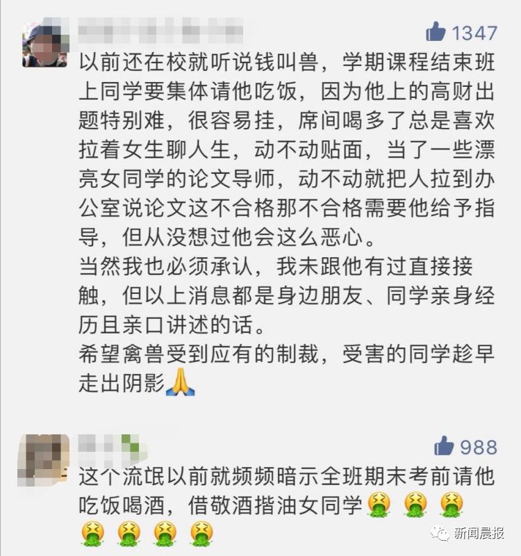事件曝光后,受到关注转发和评论。一些自称钱姓教授的学生说,该老师出题难,并且有考前请其吃饭的传统,还有人直接表示,自己也遇到过该老师的骚扰。