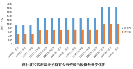 4月28日晚,金石资源披露的2026年一季报显示,高雅萍持股为1841.16万股,占上市公司流通股总股本2.07%;蒋仕波持股量为1018.52万股,占上市公司流通股总股本1.21%。二人合计持股占上市公司流通股总股本3.28%。