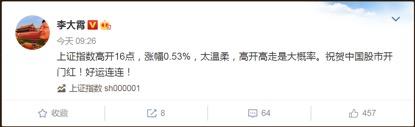对于这样的开盘,英大证券首席经济学家李大霄表示:“太温柔,高开高走是大概率。”