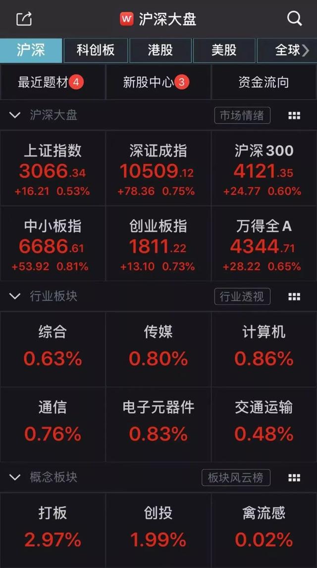 开盘后,两市有所震荡,创业板指一度“翻绿”。但很快,三大指数进入单边上升趋势,权重板块搭台,题材股表现精彩纷呈。