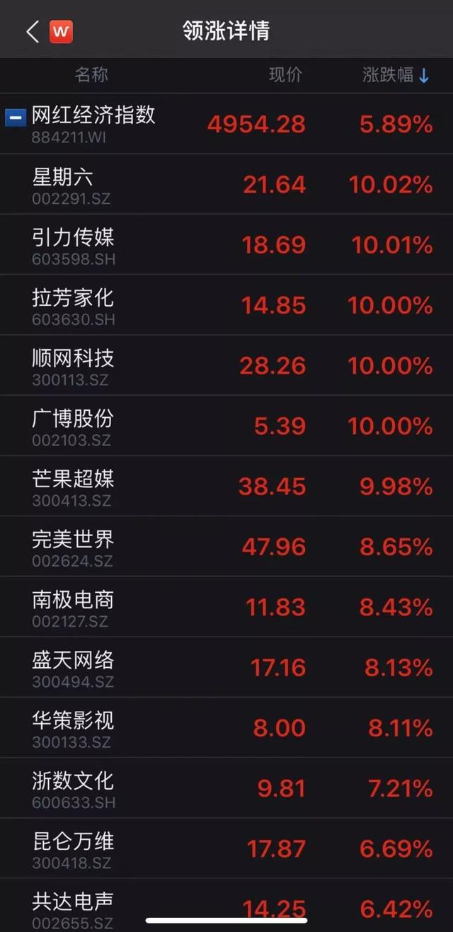 题材股方面,网红经济板块领衔概念板块的上涨。板块内星期六、引力传媒、拉芳家化、顺网科技、广博股份涨停。