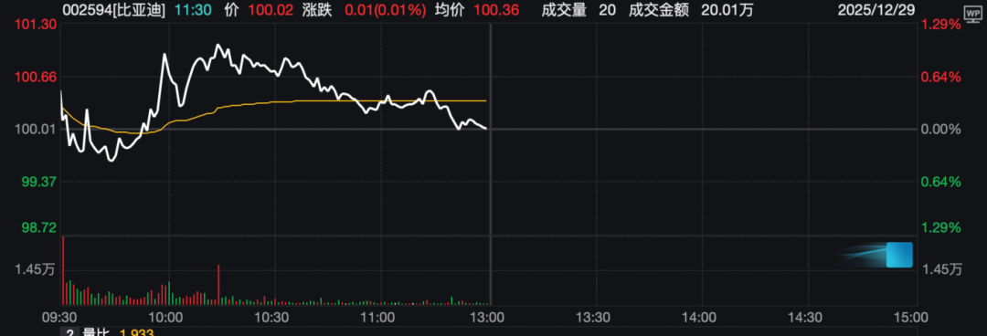 盘面表现上,今日,比亚迪(002594)盘中一度涨超1%,午间收盘微涨。