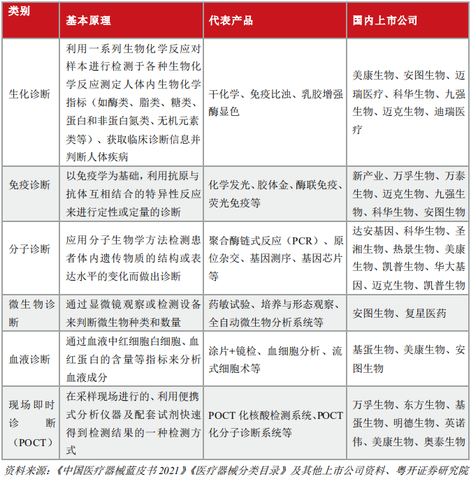 体外诊断产品主要由诊断设备(仪器)和诊断试剂构成,根据检测原理方法以及检测环境条件可以分成包括生化诊断、免疫诊断、分子诊断、现场即时检测(POCT)等主要领域。
