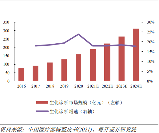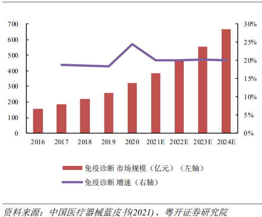 细分领域来看,免疫诊断市场规模最大,2022年预计市场规模462亿元,约占体外诊断总体29.31%;