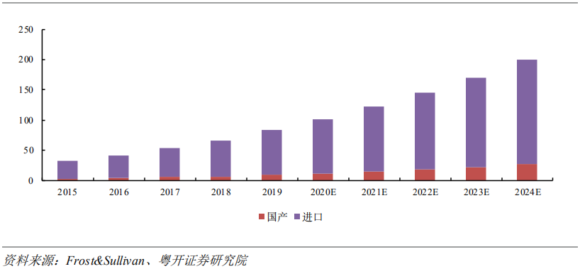 国内上游原材料起步较晚,储备不足。根据弗若斯特沙利文统计,2019年中国体外诊断试剂原料市场中进口品牌占比约88%、国产品牌占比约12%。新冠疫情改变全球产业链供应链格局,加之国家政策强调关键原材料供应链安全、“卡脖子”工程等问题,国内关键原料企业近年来加快成长。预计国产体外诊断试剂原料市场规模将以23.3%的年复合增长率增长,到2024年达到27亿元,逐步实现进口替代,减轻中下游成本压力。同时,头部企业近年来亦通过海外收购、自建平台等方式纵向布局,实现关键原材料自主可控布局。