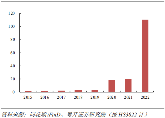 与此同时,海外布局成为新的增长点。2015-2022 年,体外诊断试剂(按海关编码HS3822 计)出口金额由1.52亿美元增长至110.31亿美元,年均复合增长率达到84.39%。